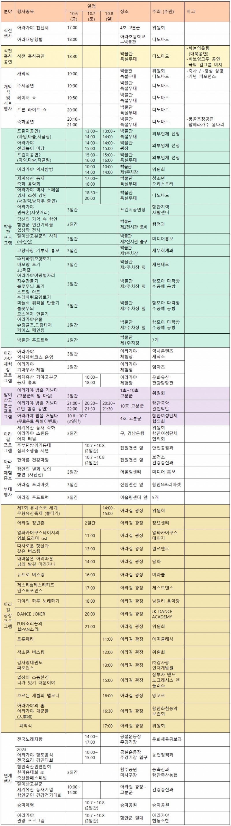 함안 아라가야 문화제는 10월 6일(금)~10월 8일(일)까지 3일간 개최되며 주요 일정은 아래와 같습니다. 3일간 다양한 프로그램으로 행사가 진행 되니 아래 표를 참조 하시기 바랍니다.