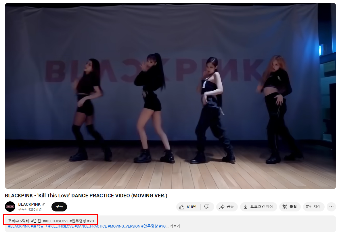 블랙핑크 "킬 디스 러브(Kill This Love" 안무 영상이 유튜브 조회수 5억뷰를 돌파 했습니다. 유튜브 공개 이후 4년 10개월 만에 달성한 기록입니다.