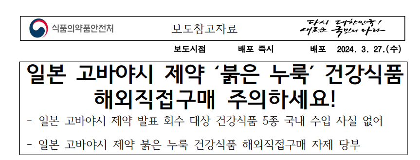 이번에 고바야시 제약이 회수대상으로 발표한 붉은 누룩(홍국) 건강식품(5종)은 현재 국내 정식 수입은 되지 않은 것으로 확인되나, 식약처는 해당 제품에 대한 해외직접구매를 방지하기 위해 국내 플랫폼사 등에 해당 제품에대한 상세정보를 제공하고 판매 자제를 당부하고 있습니다.