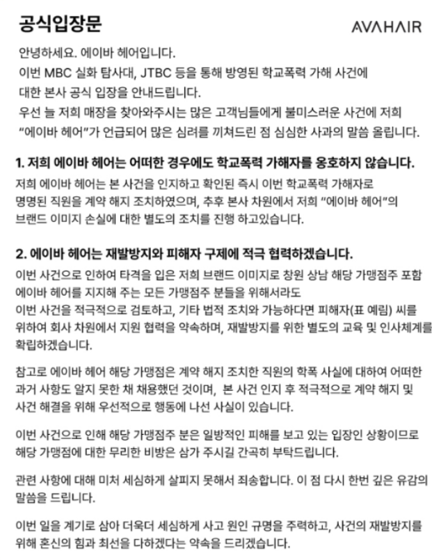 [에이바 헤어 입장문]